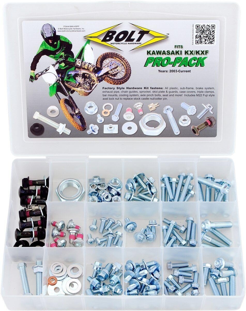 This Pro-Pack includes a comprehensive selection of bolts tailored for Kawasaki KX and KXF models, making it a reliable choice for riders looking to keep their bikes in top condition. With its durable construction, this kit provides long-lasting support, reducing the need for frequent replacements and maintenance.